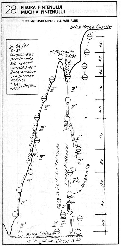 O treaptă stâncoasă (a 3-a L.C.) şi apoi un brâu îngust conduc spre dreapta, la baza Fisurii Pintenului.