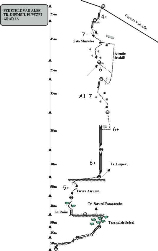 - ieșind în Creasta Văii Albe şi se coboară pe creastă către Brâna Aeriană. Pe parcurs găsim mai multe ancore mecanice roșii pe care le putem folosi pentru rapel în caz de oboseală sau vreme nefavorabilă. Traversăm Brâna Aeriană (ce are pe tot parcursul ei cablu metalic), Se coboară apoi într-un vâlcel, pe care se continuă până la finalul lui, se face stânga, se intră în alt vâcel pe care în coborâm cu ajutorul unor lanţuri. După ce se termină lanţurile se mai coboară 50 m, apoi se ţine potecuţa de pe crestuliţa din dreapta (cum coborâm). Traversăm dreapta pe o brână (pe deasupra Peretelui Vâlcelului Stâncos), coborâm un fel de vâlcel cu lanţ şi ajungem de unde am plecat, în locul La Pândă. De acolo în 20 de minute suntem înapoi la Refugiu.