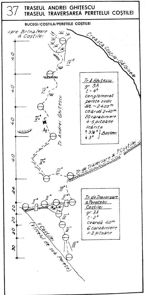 Urcămpe Valea Coştilei. Trecem de Hornul din Peretele Coştilei şi cam la 30 m în amonte vedem un vâlcel înclinat care urcă diagonal spre stânga în perete. Dacă dorim să sărim primele 3 lungimi depitonate, putem începe de pe brâna de unde începe şi traseul Poseidon.