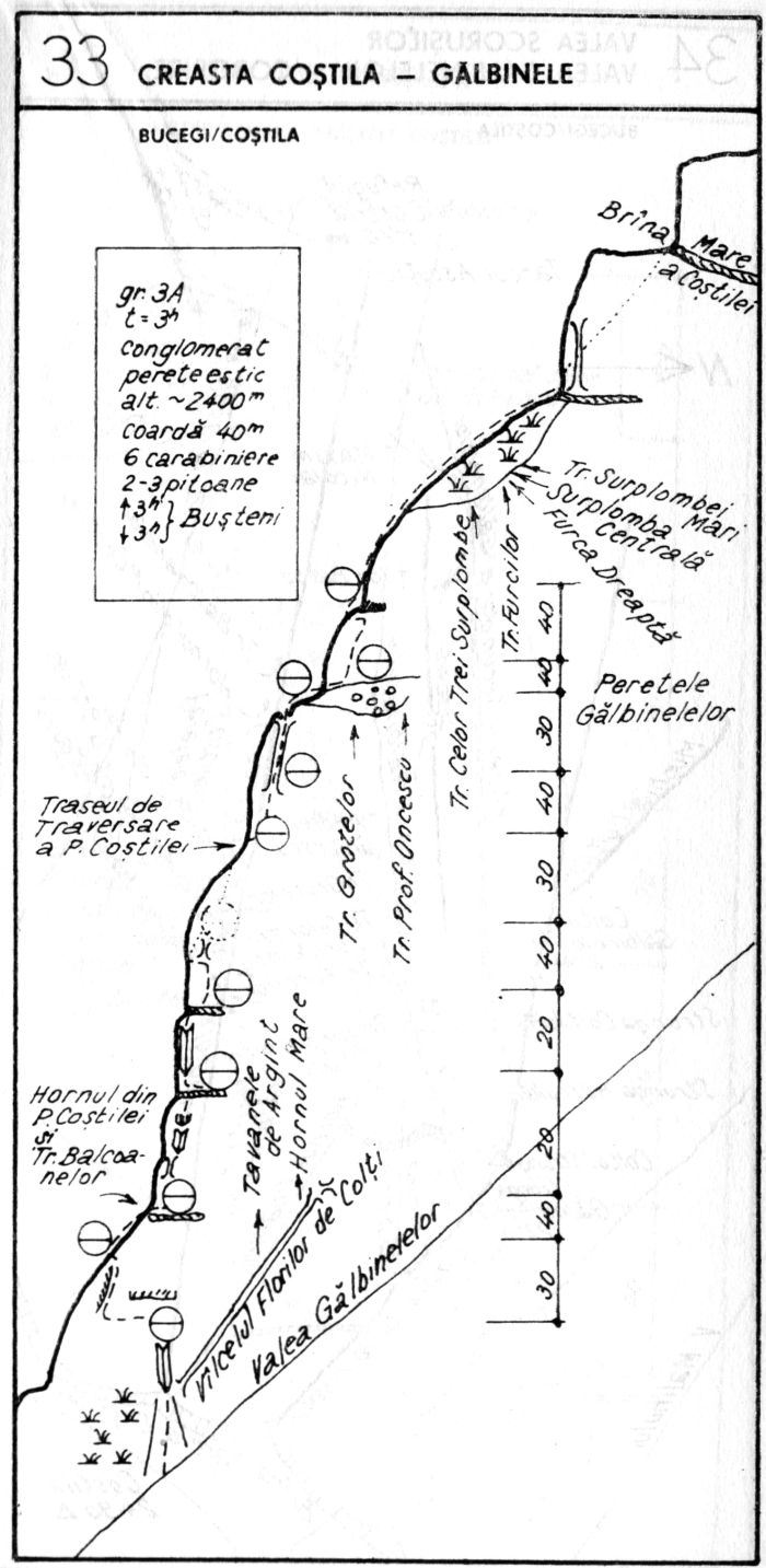 LC 1 (40m, 4): Se urcă faţa căzută compactă, căţărare frumoasă pe alveole şi pietre încastrate. Se regrupează sub Pintenul Coștilei (țancul ce se vede de jos) la 2 pitoane. Pe parcursul lungimii se găsesc 3-4 asigurări fixe, pitoane și ancore chimice.