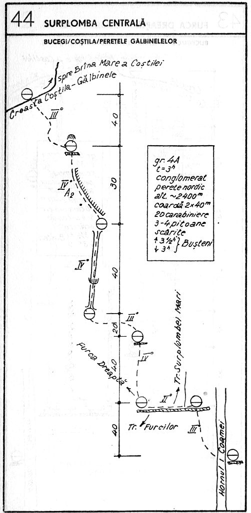Din Hornul Coamei, două l.c. se merge spre baza Furcilor. În locul în care brână coboară, ne abatem urcând oblic spre stânga o l.c., apoi traversăm la stânga altă l.c.. Urcând un horn vertical, friabil şi surplombant ajungem la „Surplomba Centrală", înclinată spre stânga, echipată cu pitoane, după care ieşim în Coama de Piatră.