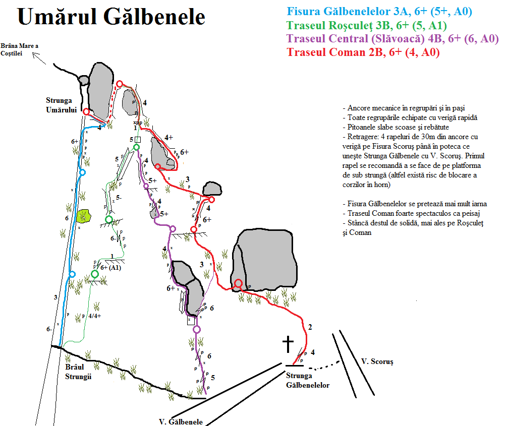 - 4 rapeluri de 30 m până în poteca ce unește Valea Scorușilor de Strunga Gălbenelelor. Primul rapel este recomandat să se facă imediat sub Strunga Umărului (la 5 m mai jos), de pe o platformă de 2m x 2m, altfel riscăm să blocăm corzile în hornul de sub noi. Toate rapelurile se fac din spituri cu mailon.