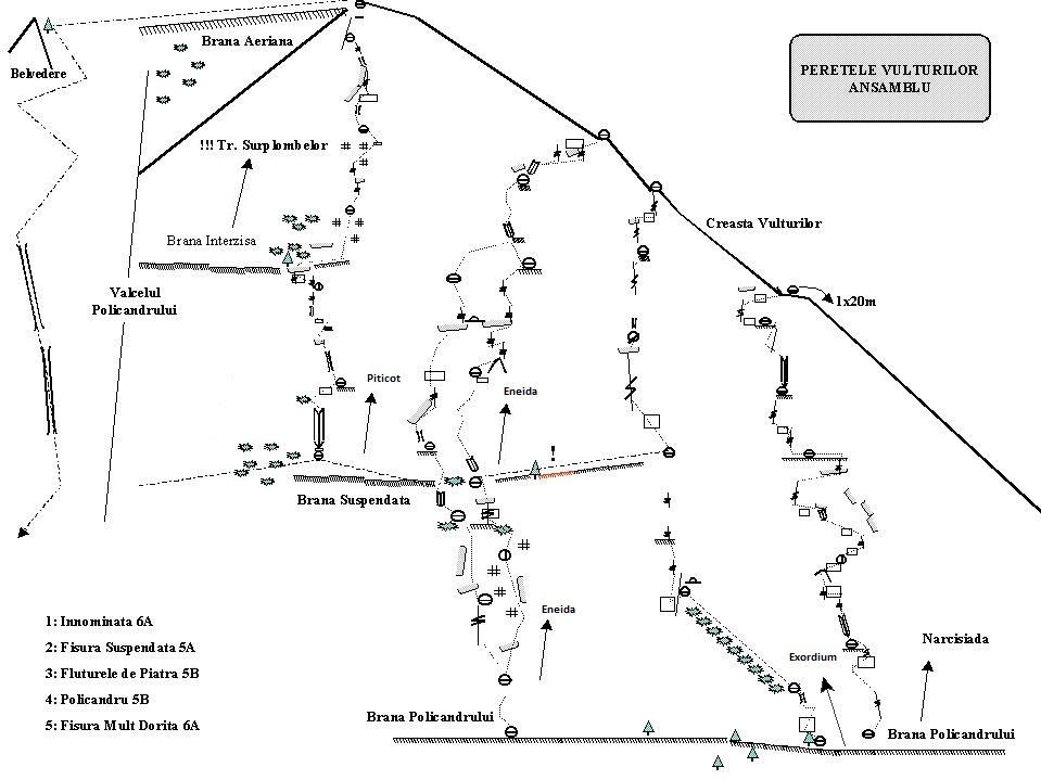 | 5 | Fisura Policandrului | 5B, 7+/8- (6, A1) | 7 LC | ■ Traseu clasic | |